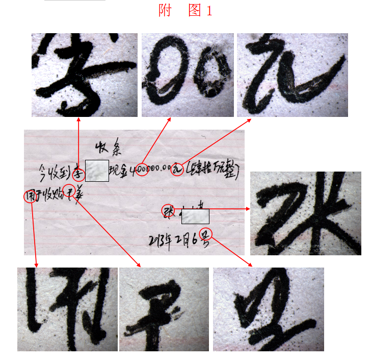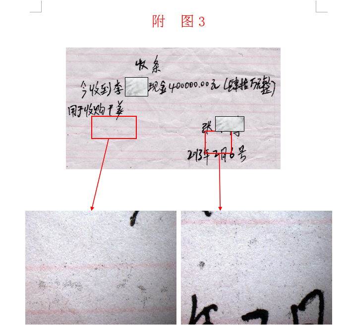 2、在体视显微镜下放大观察,发现检材中的字迹大部分笔画由两种色料组成,一种为黑色墨粉颗粒,一种为黑色墨水(见附图1),黑色墨粉颗粒堆积形成的笔画比较完整,黑色墨水形成的笔画有残缺;放大观察两种笔画相交部位,发现黑色墨水形成的笔画在黑色墨粉颗粒形成的笔画之上(见附图2);放大观察检材纸张空白处,发现有散落的黑色墨粉颗粒分布(见附图3)。