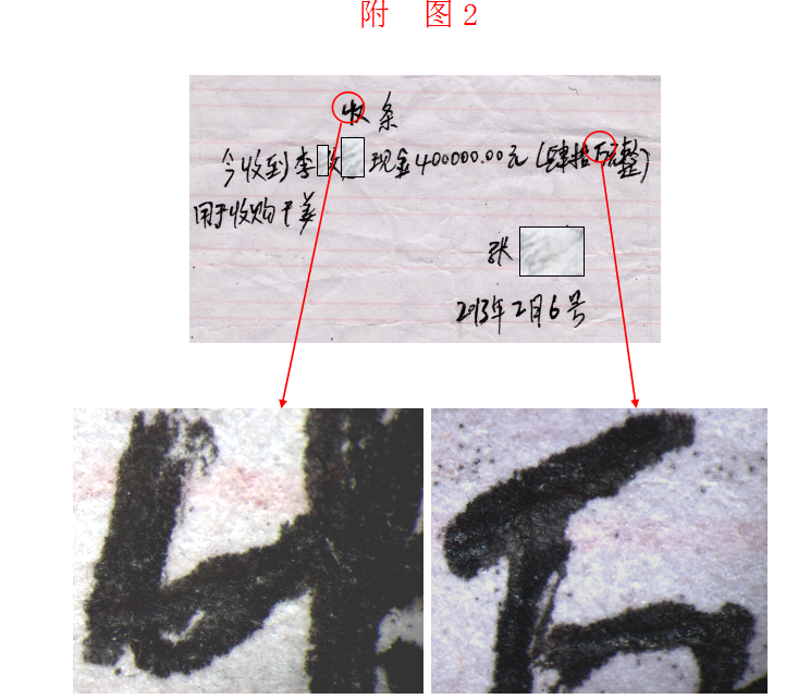 3、自然光下观察,样本中的字迹为黑色,经放大观察,为书写形成,“其中……20万元”字迹和落款日期有重描痕迹,且“月”与“号”中间位置纸张有破损痕迹。