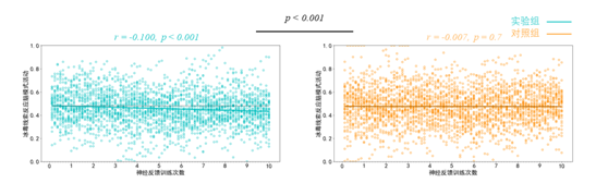 神经反馈训练的表现反映了患者调控大脑神经信号的能力,实时反馈的冰毒线索的脑活动模式通过一个概率值反映,该概率值表示当前大脑活动模式和毒品刺激反应脑活动模式的相似程度,即当前大脑状态多大概率上处于冰毒刺激反应脑活动模式。这个值越高说明和冰毒刺激下的大脑活动越相似,神经反馈训练的目的是让患者调低该值。图5表示随着训练次数的增加,试验组患者能够显著下调反馈信号(r = -0.100, p < 0.001),而对照组患者则没能显著下调神经反馈信号(r = -0.007, p = 0.7),两组直接存在显著的交互效应。这说明通过真实的反馈,试验组确实能够更有效调控自己的神经信号。