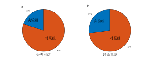 截至目前,对完成训练的42人进行出所后三个月的回访,其中试验组23人,对照组19人。总共有5人丢失回访,其中试验组1人,对照组4人,试验组回访丢失率低于对照组(图10a)。此外,在所有参与回访的患者中,共有11人表示出所后与过去吸毒旧友有联系,其中试验组3人,对照组8人(图10b)。由此可以推测,相对于对照组,试验组更容易保持操守(即复吸率更低),更愿意积极建立新的健康的朋友关系。