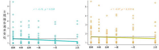 图7表明经过神经反馈训练后,试验组的渴求降低能够有效维持(r = -0.16, p = 0.03),而对照组渴求降低则没能维持(r = -0.07, p = 0.319)。