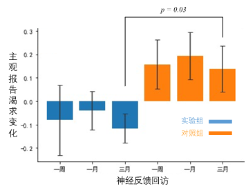 为检验神经反馈训练的短期效果,对比试验组和对照组在经过10次训练后一周、一个月、三个月的冰毒渴求变化。结果发现,相对于训练前,试验组在训练后一周(p = 0.03)、一个月(p = 0.02)和三个月(p = 0.02)渴求呈下降状态,并达到了显著性,而对照组则没有这样的趋势,也未达到显著性。试验组主观报告的渴求回访的结果表明,在训练结束后的三个月的回访时,两组渴求降低的值达到了显著性(F=4.82, p=0.032)(图6)。说明相对于对照组,试验组主观上认为自己对冰毒的渴求显著降低。