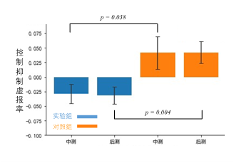 图9表示,经过神经反馈训练,在Go-Nogo任务中虚报率(毒品刺激Nogo,中性刺激Go情况下,对毒品刺激做出Go反应的概率)相比干预训练前的下降程度,两组达到了显著(中测F= 4.47, p = 0.038,后测F = 9.15, p = 0.004),说明经过神经反馈训练,试验组患者的抑制控制能力得到增强。