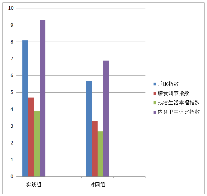 一是戒毒人员睡眠、膳食调节、戒治生活幸福、内务卫生评比、参与教育矫治各类活动、戒断信心、习艺劳动效能、诊断评估综合等指标,实践组明显高于对照组,实践表明健康管理融入戒毒人员教育矫治的衣食住通学乐健中,进行管理和干预并加以持之以恒修善不健康嗜好和行为,牵引出戒治正向激励作用。