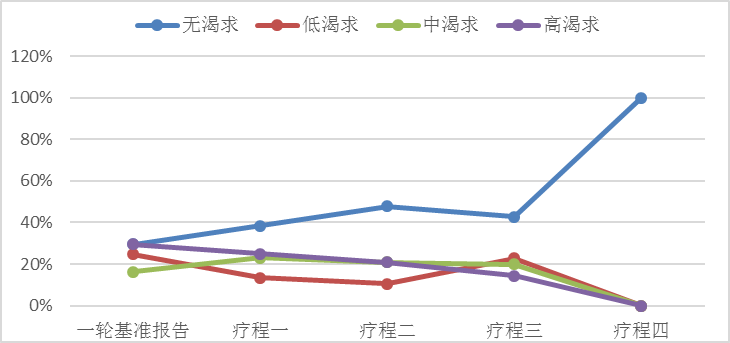 (3)轻度渴求人员数:3人渴求度出现下降,进步率为60%;轻度渴求人员5人中降为无渴求3人,治疗率达60%。