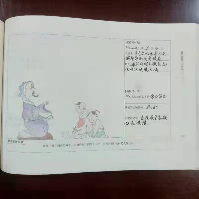 画的是孔子教学。他认为自己的文化水平还不足,画完充满求学的欲望和渴望。