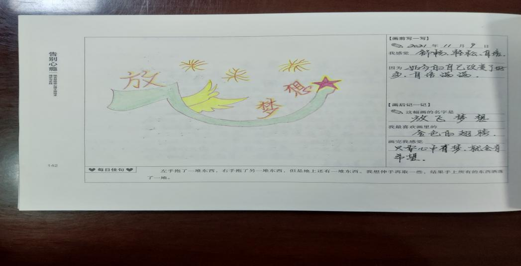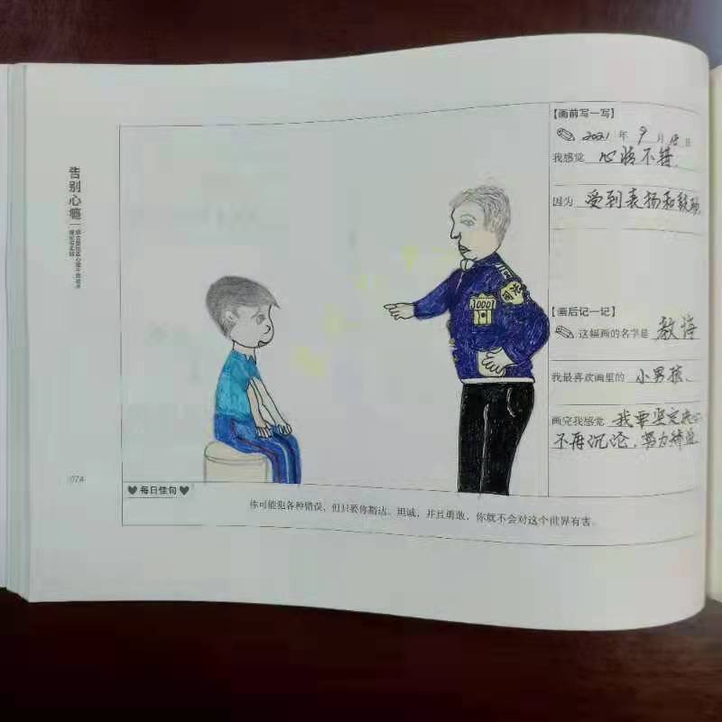 历时九周的《告别心瘾:统合型绘画心理干预技术理论与实践》绘本绘画活动,不仅使戒毒人员去思考感悟,全面、正确地了解自己;也使他们通过绘画的方式去记录每日所思、所感,表达平日中不愿意和或难以与他人所想表达的内心世界和情感;还通过绘画舒缓情绪、释放压力,减轻负面情绪。该戒毒人员在绘本分享中写道:我学会了冷静反思,从自身找问题,不是一味的愤怒和敌视社会,对自己所处的境遇和这个社会有了更加全面、深刻、清晰的理解。