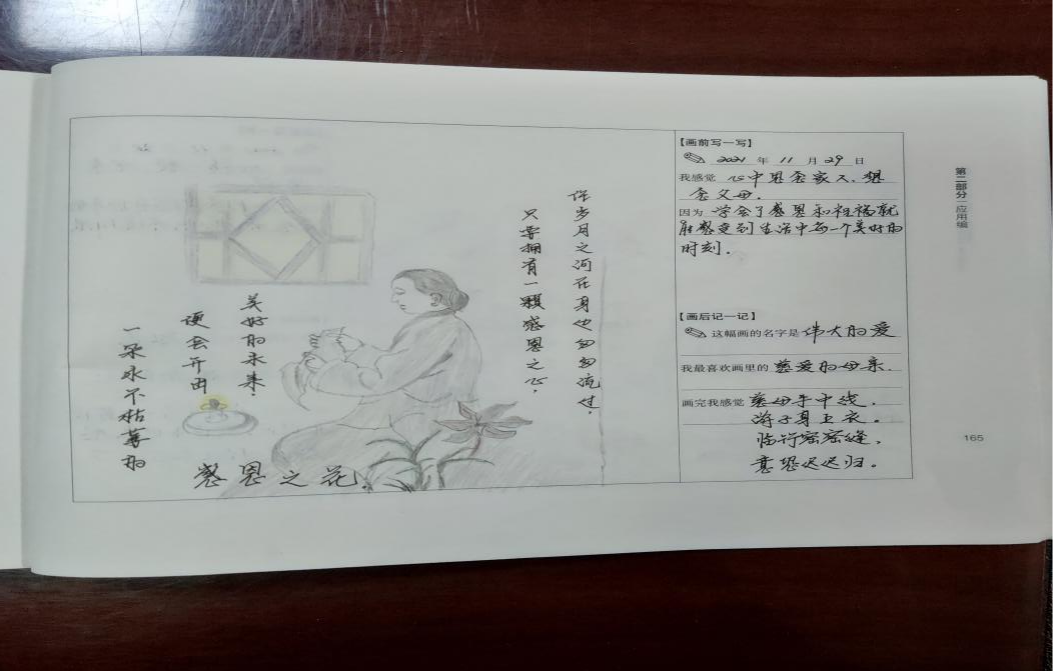 赵某很好的利用绘本进行了情绪的记录和抒发,表达的是他真实的内心世界,首先下笔回忆的是自己最亲的人,如果说什么最让他割舍不下,一定是妈妈,用一幅慈母手中线记录的是妈妈对他的爱。在创作的过程,将潜意识中痛苦、悲伤和焦虑的情感,以及因为潜意识潜藏已久而产生的痛苦、悲伤、抑郁、焦虑的节点,从潜意识中通过绘画作把它呈现出来,用直观的画面进行思考、回忆,把自己内心的不良情绪进行自我的处理。