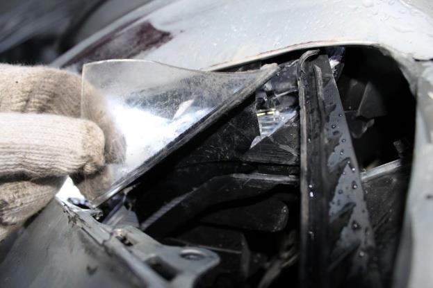 散落物B与被鉴车辆左前灯具组灯罩损坏断裂处(见图10)进行拼接比对,该散落物表面痕迹状况与被鉴车辆左前灯具组灯罩表面痕迹状况连续,断裂痕迹边缘相互吻合。(见图12)