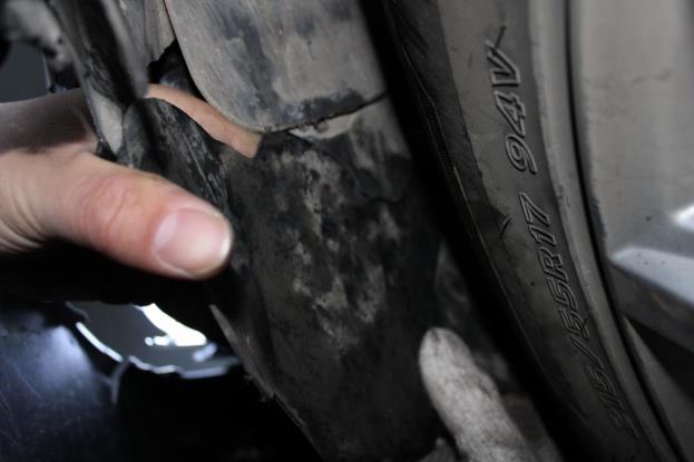 将上“1”所述的散落物A与被鉴车辆左前轮前挡泥板损坏断裂处(见图9)进行拼接比对,该散落物表面痕迹状况与被鉴车辆左前轮前挡泥板表面痕迹状况连续,断裂痕迹边缘相互吻合。(见图11)