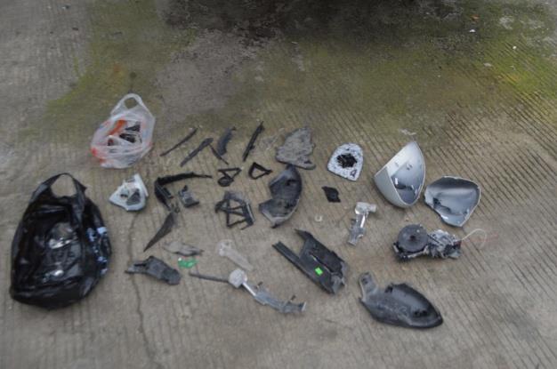 事故现场路面上提取的散落物(见图7、图8)分别与某品牌轿车左前轮前挡泥板、左前灯具组灯罩为同一整体分离。