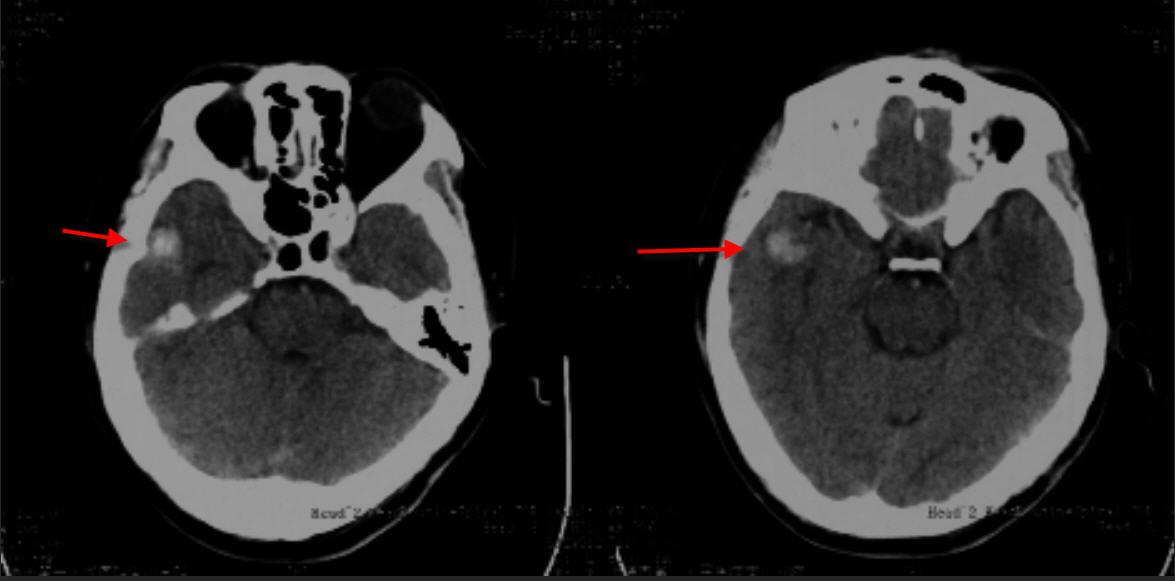 2019年2月25日头颅CT放射学诊断:右侧颞叶片状高密度影,考虑出血灶可能,左侧额部皮下软组织肿胀。