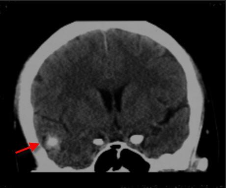 受伤当天头颅CT片显示右侧颞叶见类圆形高密度影