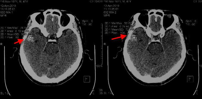 2019年4月12日本院头颅平扫+图像重组CT片示:右侧颞叶见类圆形高密度影,较前无动态变化。