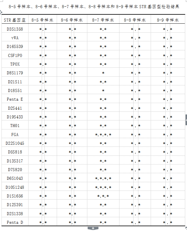 3. 8-2号样本、8-5号样本、8-6号样本、8-8号样本和8-9号样本的DNA分型结果一致,似然率为6.8540×1030。