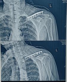 3.郑州市骨科医院影像诊断报告单(2021.04.01):左侧锁骨骨折术后,断端复位佳,金属内固定;关节结构可。