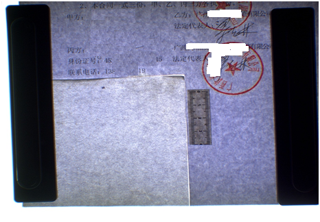 检材1、2均为原件,背面各粘贴有一张纸,正反两面的纸张光泽度不一致。其中检材1的外部轮廓和其后粘贴的纸张外部轮廓重叠性好,“丙方(保证人):”字样后方有黑色涂写区域。侧光观察可见涂写区域部分纸张纤维毛糙凸起,高光区域可见“黄某某”字样,背面可见涂抹处有红色斑点。检材2左下方有四边形缺角,缺角处粘贴有形态接近的四边形纸张,有明显的拼接痕迹。