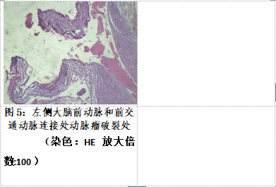 ㈢ 蛛网膜下腔广泛出血,致脑沟、脑回结构不清。在脑底动脉环的左侧大脑前动脉和前交通动脉连接处可见一囊性扩张,表面可见一不规则破裂口,血管破裂口边缘可见少量血凝块附着;局部镜下可见一区域血管壁呈断裂状,局部中膜明显变薄,平滑肌细胞数量减少甚至消失。管壁内可见慢性炎细胞浸润,外膜可见数量不等的红细胞聚积。第四脑室及小脑延髓池可见积血。故证实因左侧大脑前动脉和前交通动脉连接处动脉瘤破裂致蛛网膜下腔出血、第四脑室及小脑延髓池积血客观存在。