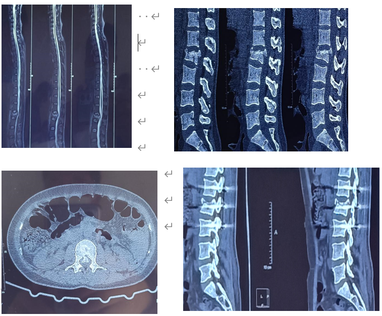 入院查体:脊柱稍后凸,椎旁压痛、叩击痛可及,双侧直腿抬高试验(-),双侧股神经牵拉试验(-),双侧髋关节、膝关节、踝关节活动可,双下肢肌力5级,感觉及末梢循环未及明显异常,生理反射存在,病理反射未引出。