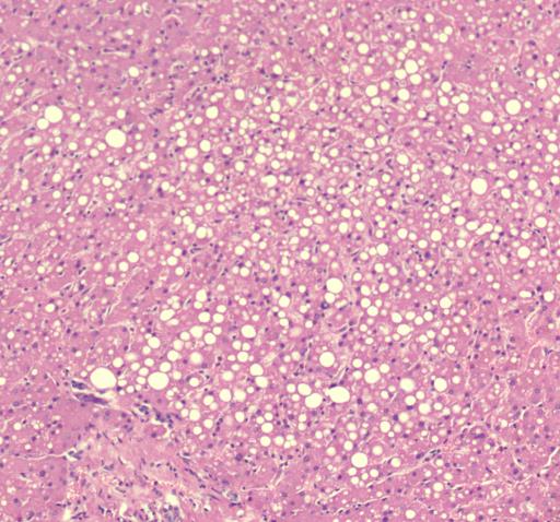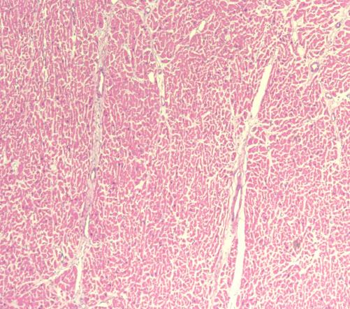 镜检:肝细胞轻度自溶,肝小叶结构尚可辨,肝窦扩张,肝索排列正常,肝细胞弥漫混浊肿胀。局灶肝细胞脂肪变。