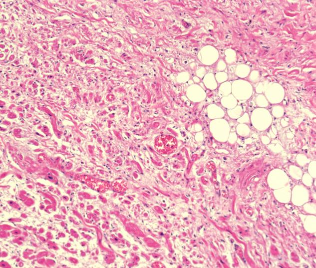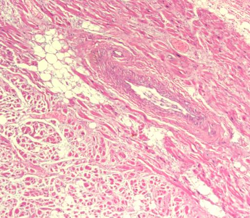 镜检:心脏轻度自溶。心肌纤维粗细不一,部分拉长变细,以乳头肌为甚,部分呈不规则波浪状排列,心肌间纤维组织增生和脂肪组织浸润,心肌被分隔为条索状,局部心肌纤维嗜伊红染色增强,部分横纹消失,部分心肌细胞核消失。窦房结纤维组织增多,结细胞减少,纤维化程度>75%,窦房结和房室结与束支内见脂肪细胞浸润。