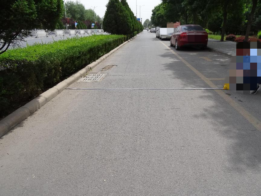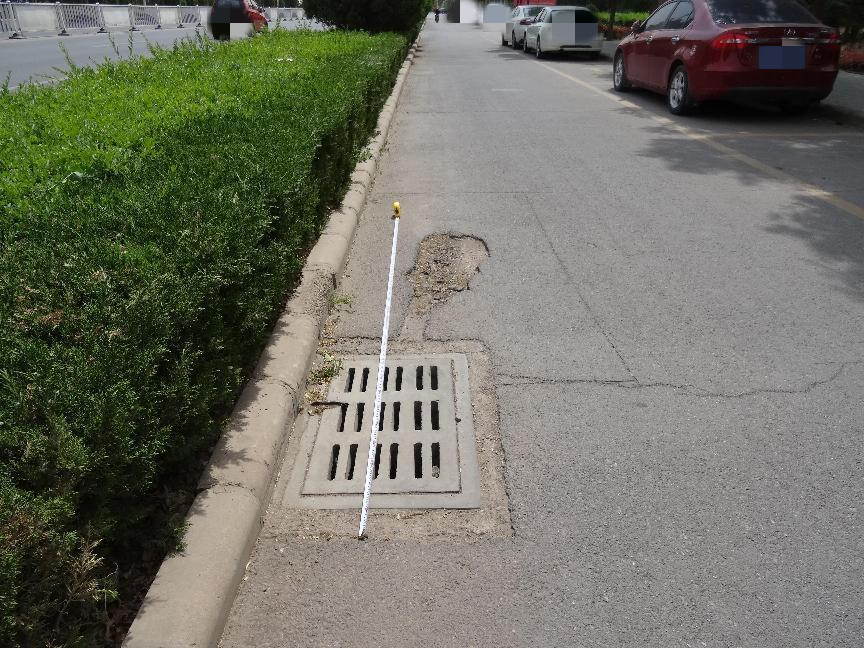事故路段位于某某市某某街“XXX”公交站牌南侧非机动车道,该非机动车道为东西走向,道路全宽550cm,路表为沥青铺装路面,左右两侧均装设左11cm、右14cm高的路缘石。由西向东方向右侧利用黄色涂料施划宽220cm的停车位,该非机动车道可供通行区域的宽度为330cm。非机动车通行区域左侧装设下水井盖,由西向东方向距该下水井盖中心145cm处见115cm×42cm、深度为6cm的沥青缺损,形成路表坑(图1)。