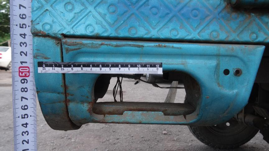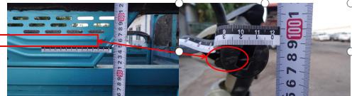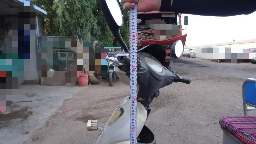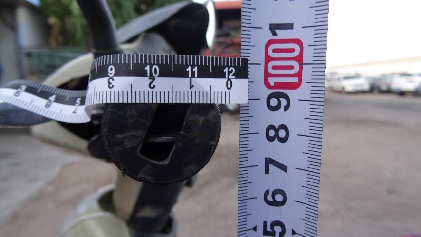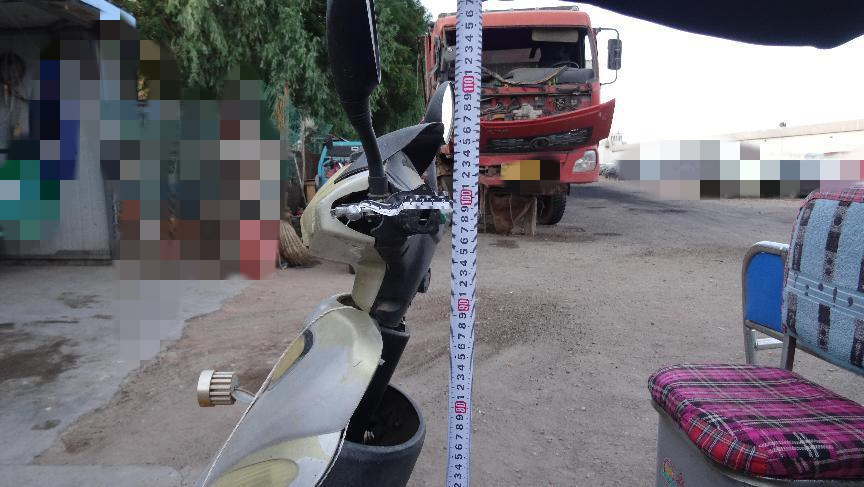 转动方向把至左右极限位置,测量左侧方向把的距地高度变化范围由最低位94cm至最高位103cm(图13)。左侧脚蹬板外侧端部见由外向内形成的碰击摩擦痕迹,边缘呈散乱形态。货厢前部安装的护杠左侧上顶部距地103cm处见摩擦痕迹,银色金属护杠表面呈内外方向凹凸变形。