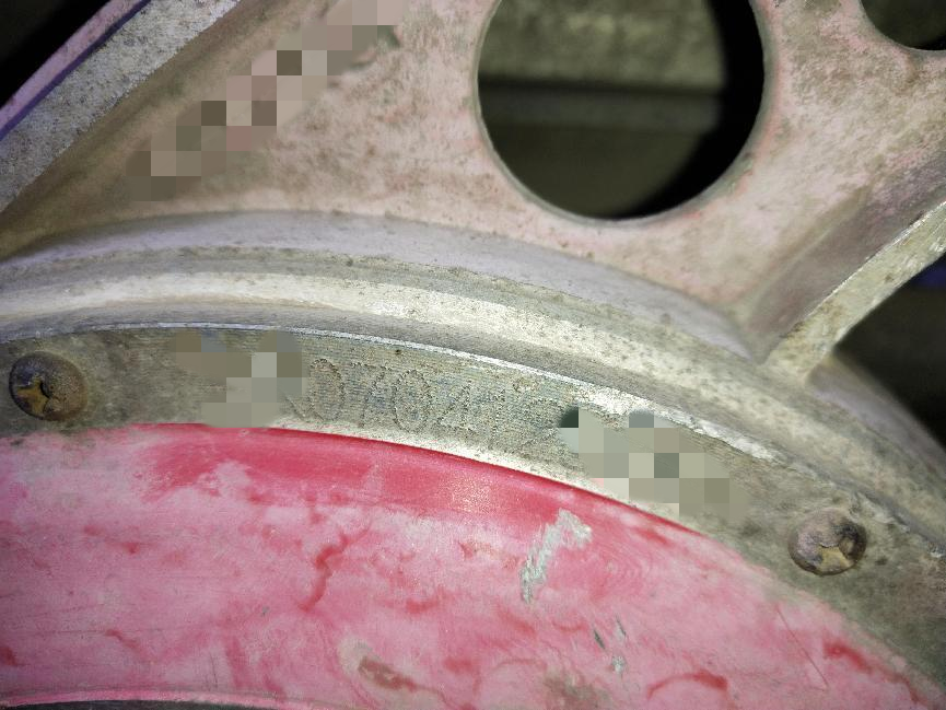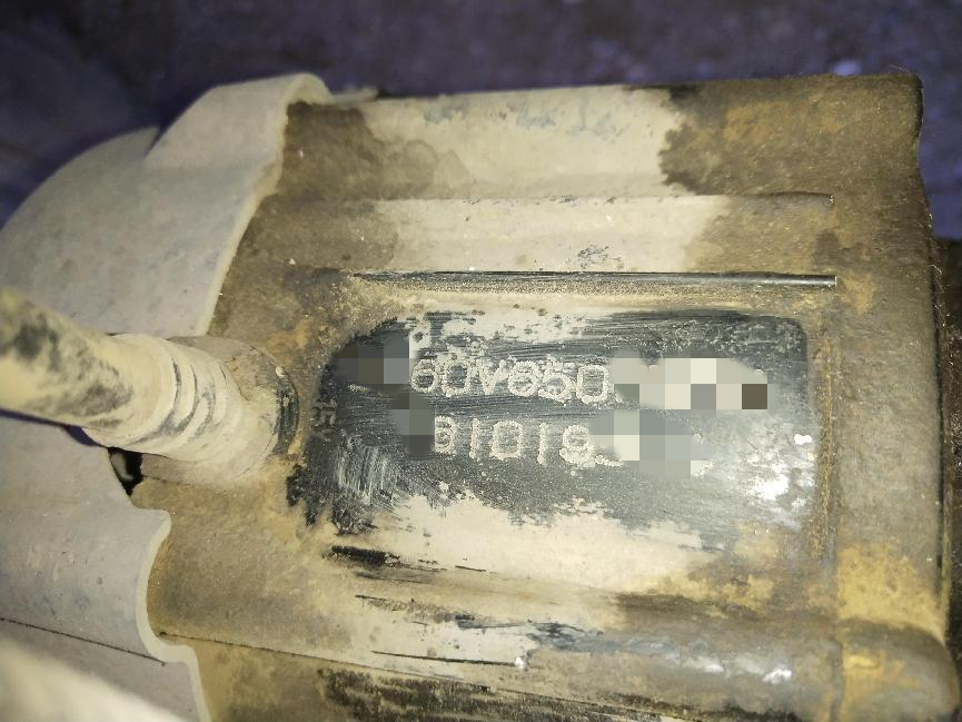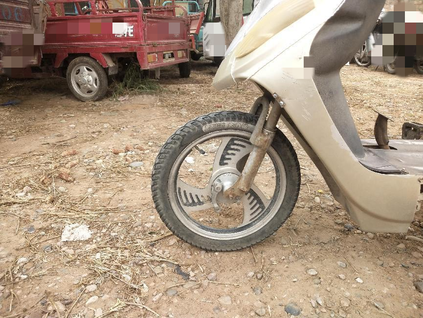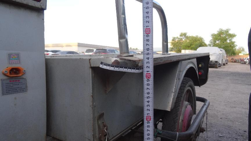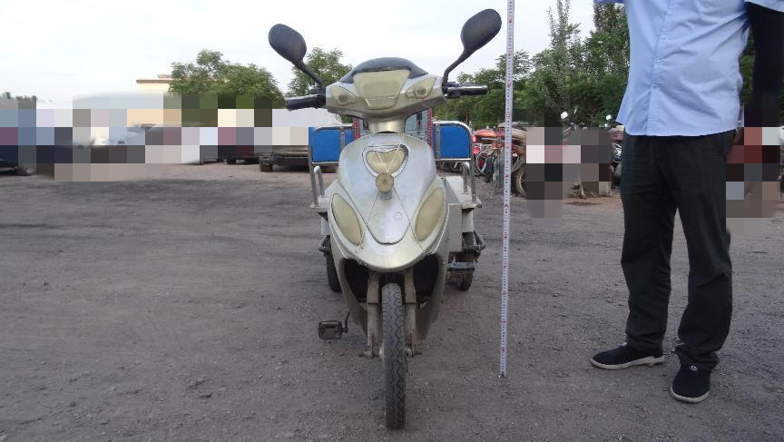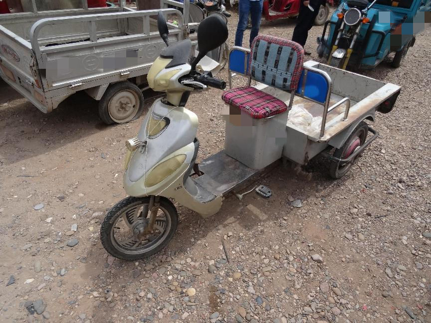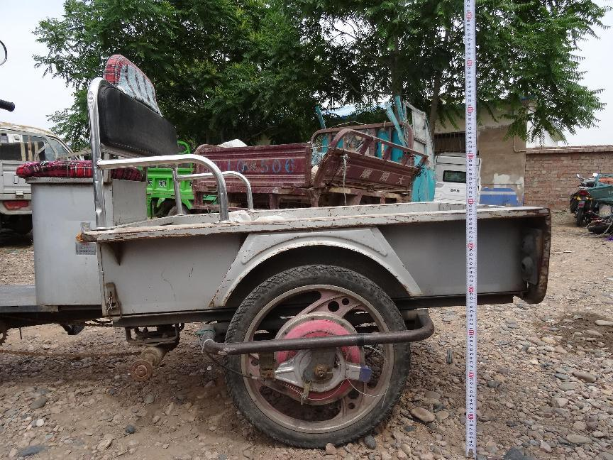 车身颜色为银灰色,整体显陈旧。车身结构为正三轮电动车,后轮电机驱动,电机编号为XX0704XXXX(图9)。