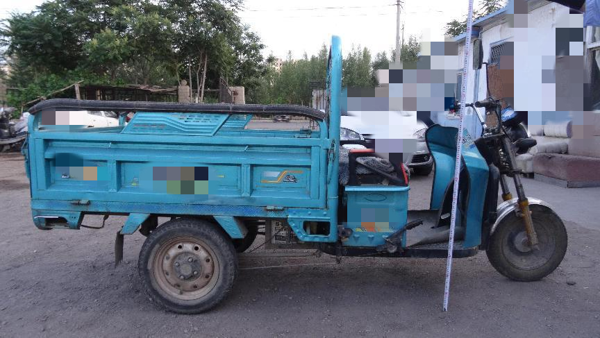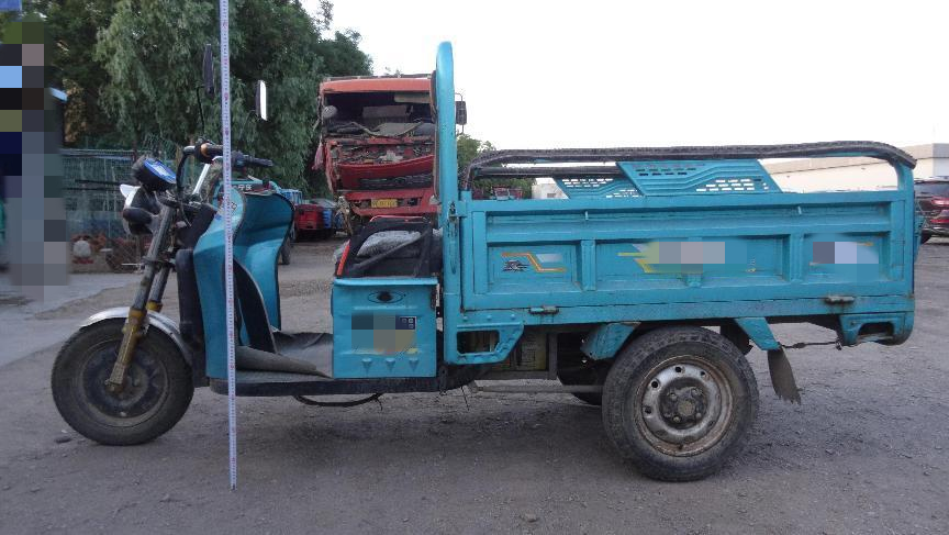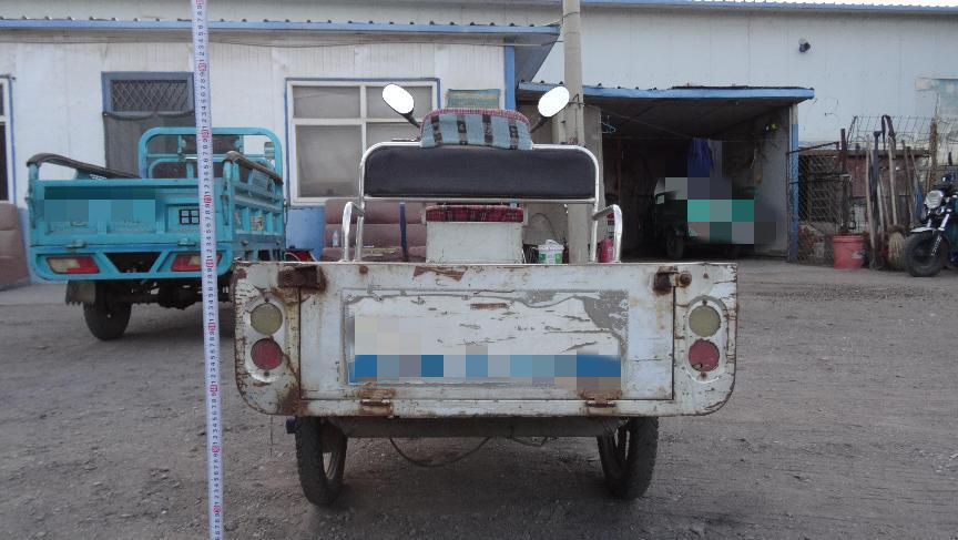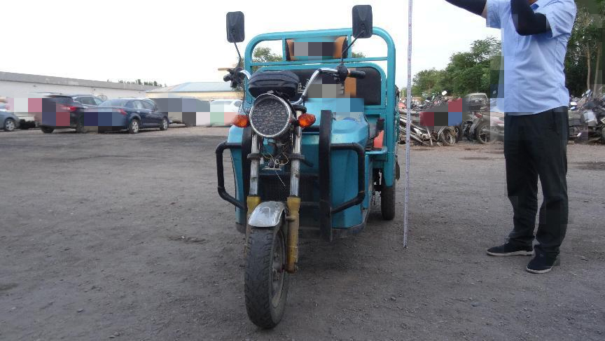 车身颜色为蓝色,车身结构为正三轮电动车,后轮电机驱动,电机编号为SD60V65XXXXH16101XXXX(图2)。