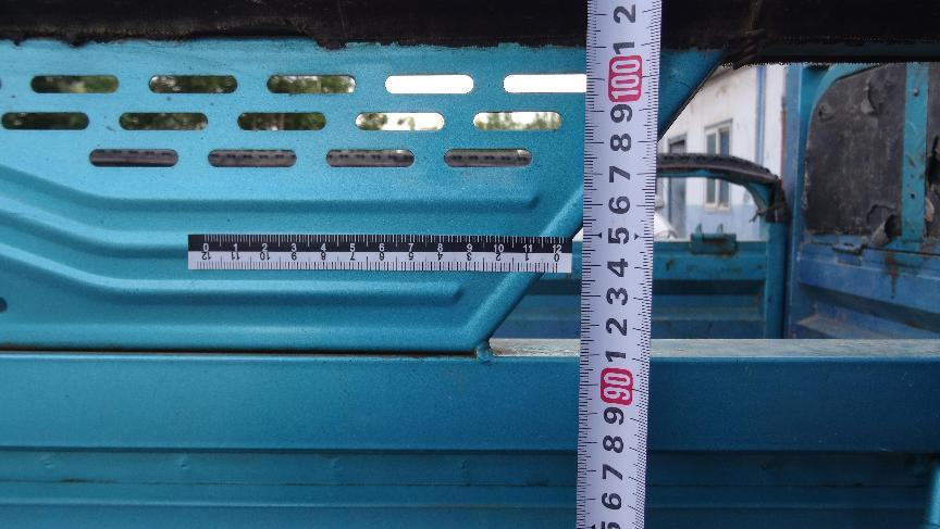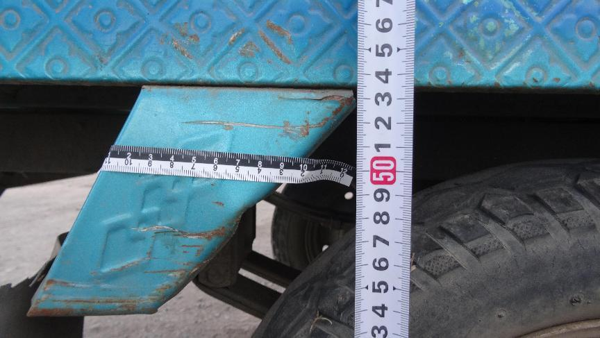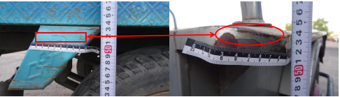 对车身右侧进行检验发现,货厢右后角部位距地52cm处见2cm×0.5cm由前向后形成的刮擦痕迹(图5)。该痕迹上端距地53.5cm处见12.5cm×1cm刮擦痕迹,该痕迹显陈旧,局部漆面脱落伴有锈蚀。检视发现,在右后轮后挡泥瓦外侧面距地52cm处见6cm×0.2cm由前向后形成的减层刮擦痕迹(图6),表面蓝色漆呈条状减少。在该痕迹下方距地46cm处见多条横向陈旧性减层刮擦痕迹。