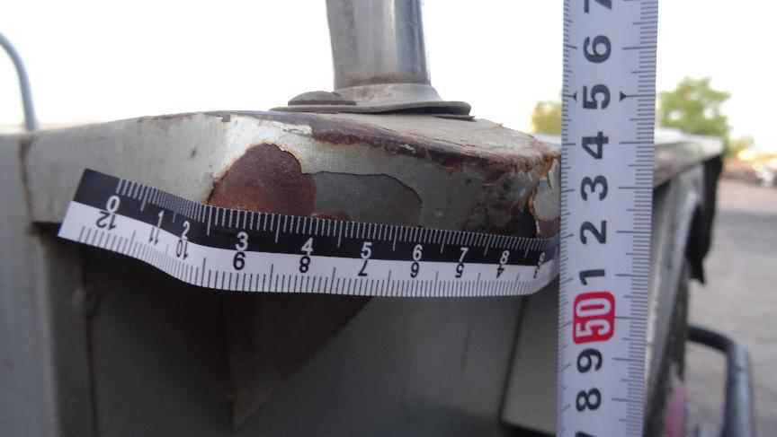 在货厢左侧上沿及车身尾部外部表面见多处陈旧性刮擦痕迹,部分减层痕迹金属层裸露锈蚀(图15)。