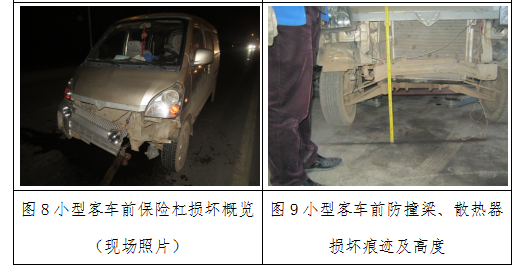 5.根据摩托车后部损坏痕迹及小型客车前部损坏痕迹的检验及比对(见图26、图27)分析可知:紧随轿车之后驶来的小型客车前下部与倒地滑行过程中的摩托车后部接触碰撞。碰撞致使小型客车漏出液体并洒落于路面、致使摩托车行驶状态发生突变。小型客车散落的水渍的起点与摩托车倒地划痕转折点相互对应,分析认为:小型客车与倒地摩托车的碰撞接触点地面位置即位于该处附近。