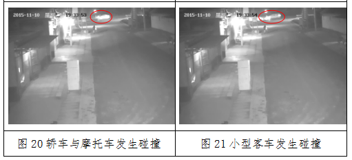 19:33:52,一辆轿车出现在视频画面右侧(见图19),向画面左侧行驶,并于19:33:53与上述摩托车发生碰撞(见图20)。碰撞后摩托车翻倒,车上乘员落地,轿车继续向画面左侧运动。两车发生碰撞的同时,视频画面右侧出现一辆小型客车,向画面左侧行驶,并于19:33:54与倒地的摩托车乘员及摩托车发生碰撞(见图21),之后小型客车继续向画面左侧运动。之后各目标车辆均被路边建筑物阻挡。