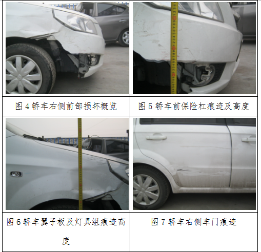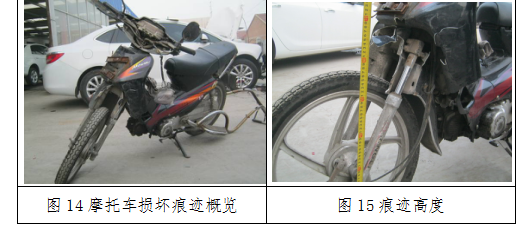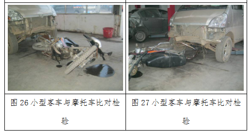 3.通过对轿车与摩托车损坏痕迹的检验可知:轿车右前侧损坏痕迹的位置、高度、形态特征(见图4、图5、图6)与摩托车左前侧损坏痕迹的位置、高度、形态特征(见图15、图16)相吻合。结合事故现场照片、事故现场勘查资料及对两车的模拟比对检验(见图24、图25)分析认为:轿车右前侧与摩托车左前侧接触碰撞。发生接触碰撞时,两车前进方向成锐角。