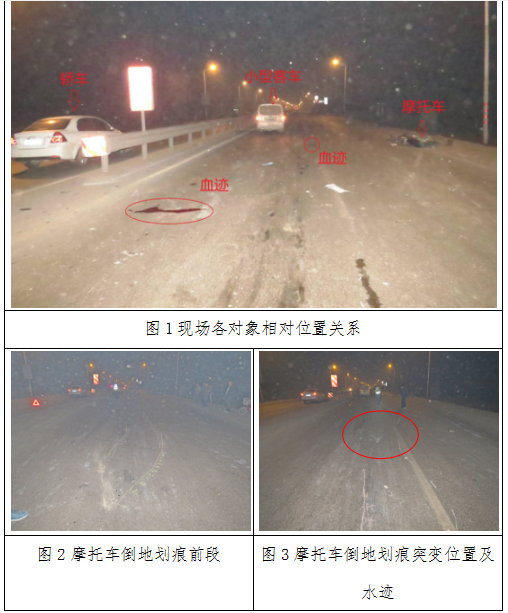 轿车车头指向北停于中央隔离护栏以西内侧机动车道,小型客车车头指向北停于中央隔离护栏以东内侧机动车道,摩托车车头指向北偏西,左侧倒地骑跨中央隔离护栏以东外侧机动车道与非机动车道分道线停止。(见图1)