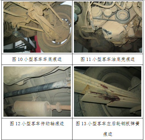 2.根据视频图像并结合事故现场勘查资料可知,本次事故中摩托车在××线××村路口处由南向西左转弯行驶中,与沿××线由南向北直行的轿车发生碰撞,摩托车乘员跌落路面。小型客车紧随轿车之后驶来,跌落路面的摩托车乘员被卷入小型客车车底,图10、图11所示小型客车车底擦痕、图12所示传动轴表面尘土的螺旋状擦痕及图13所示小型客车左后轮钢板弹簧上附着的血迹、毛发即为摩托车乘员卷入车底时形成的。根据固定式视频图像显示时间计算,从轿车与摩托车接触碰撞到小型客车与落地摩托车乘员接触并卷入车底的时间间隔约为1s。