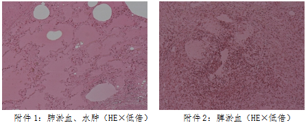 胃、肠:粘膜未见溃疡、出血,粘膜下层血管高度淤血。