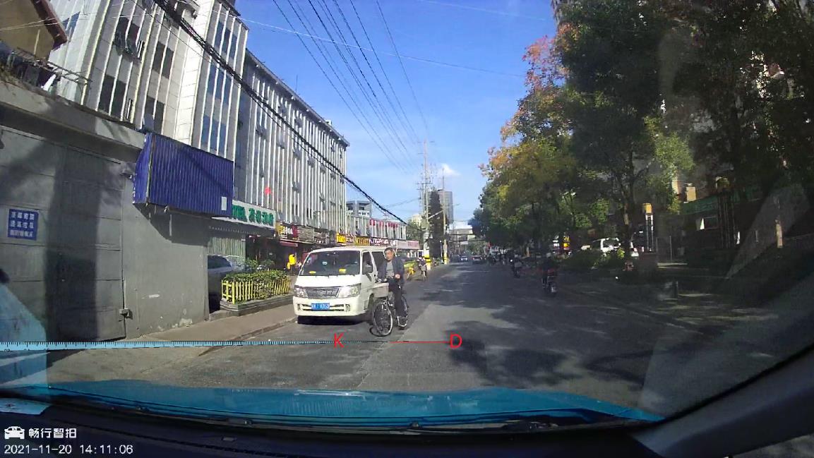 在14:11:06第17帧图像上,参考线K近似到达上述窨井盖前方另一处沥青补块的远端边缘(线),将该边缘线设为D线;