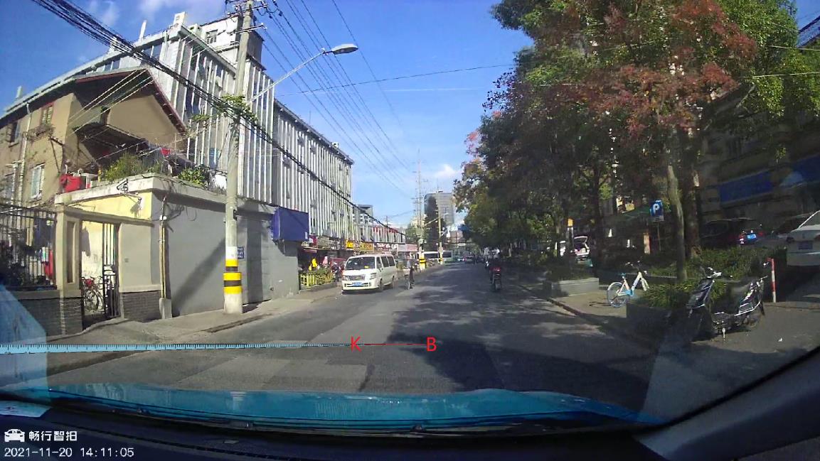 在14:11:05第15帧图像上,参考线K近似到达上述沥青补块一条远端边缘(线),将该边缘线设为B线;