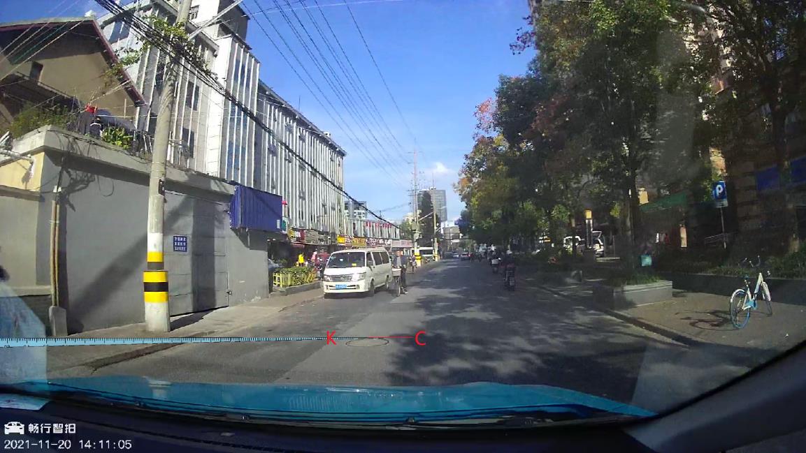 在14:11:05第29帧图像上,参考线K近似到达上述沥青补块前方一窨井盖远端边缘(线),将该边缘线设为C线;
