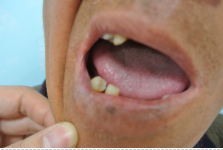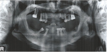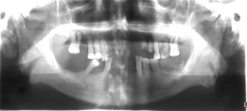 2016年10月20日曲面断层示:口腔内多颗牙齿缺失,分别为右上126、左上12、右下1247、左下1267,其中双侧上下切牙牙槽骨隐见牙槽窝,片中所示牙槽骨吸收明显,遗留牙齿的牙槽骨吸收均达根长的1/2以上。