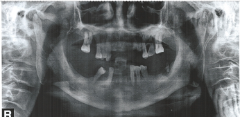 2017年2月28日曲面断层示:口腔内多颗牙齿缺失,分别为右上126、左上12、右下1247、左下1267,其中双侧上下切牙牙槽骨隐见牙槽窝,较前片稍变浅,片中所示牙槽骨吸收明显,遗留牙齿的牙槽骨吸收均达根长的1/2以上。