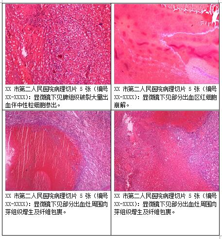 病理科专家2022年06月01日会诊XX市第二人民医院病理切片5张(编号XX-XXXX)会诊意见:显微镜下见脾组织破裂大量出血伴中性粒细胞渗出,部分出血区红细胞崩解,部分出血灶周围肉芽组织增生及纤维包裹,呈新鲜出血与陈旧性出血共存形像,其余脾组织、脾窦扩张、空虚,呈大量出血后缺血改变,综上,符合迟发型脾破裂出血改变。