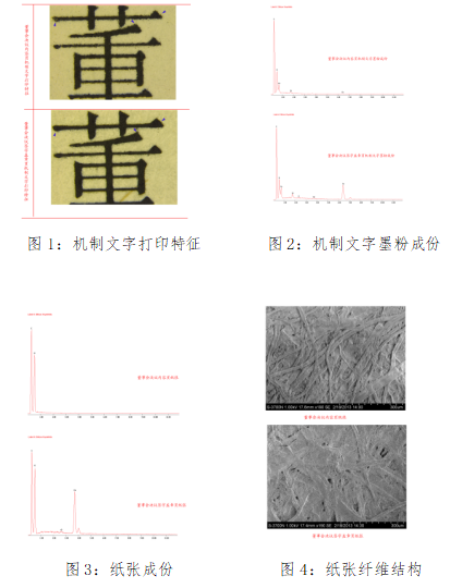 本鉴定依据《文书鉴定通用规范(SF/Z JD0201001-2010)》;《印刷文件鉴定规范(SF/Z JD0201004-2010)》;《文件材料鉴定规范(SF/Z JD0201008-2010)》;《分析型扫描电子显微镜方法通则(JY/T 010-1996)》,使用VSC6000文件检验仪、Leica M205FA荧光显微镜、PHOENIX电子能谱仪、日立S-3700N型扫描电子显微镜对送检材料进行检验: