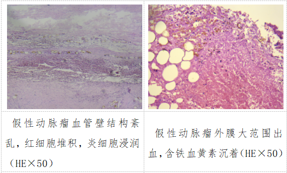主动脉假性动脉瘤是是指因创伤等因素引起的动脉壁全层破裂出血,被周围组织包裹形成血肿,临床上表现为局部疼痛、波动性包块及局部压迫症状的一种疾病。由于血管周围有较厚的软组织,在血管破口周围形成血肿,因动脉搏动的持续冲击力,使血管破口与血肿相通形成搏动性血肿,血肿机化形成外壁,血肿腔内面为动脉内膜细胞延伸形成内膜,称为假性动脉瘤。本例谈某因交通事故受伤,入院当时查CT示两肺挫伤,纵隔挫伤,左侧胸腔积液。入院后于当日行乙状结肠造瘘术+会阴部清创缝合术,8月25日因腹部切口裂开,腹内容物露出腹外,急行清创缝合术,其住院期间主要针对肛门部撕裂进行治疗,故可排除医源性因素加重损害后果的可能。尸检见左侧胸腔1600ml不凝血,1250g凝血块,左肺肺尖与主动脉弓粘连,粘连处见出血灶,钝性分离后见左肺胸膜完整无破裂,主动脉弓见一长4.5cm,直径1.5cm“瘤”,呈暗红色,该“瘤”上可见一1.0cm破裂口,周围见凝血块附着,镜下见瘤血管壁全层组织结构紊乱,大量红细胞堆积,炎细胞浸润,破口处边缘主动脉外膜显著增厚,外膜见较多炎细胞浸润,并可见大范围出血以及脂肪细胞浸润,其间纤维素样坏死,较多含铁血黄素沉着,外膜与中膜分离,中膜相对变薄,弹力纤维少、断裂及坏死,内膜灶性轻度分离。说明其存在主动脉弓假性动脉瘤,该瘤形成特点符合外伤所致。