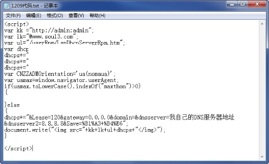 3.在检材2光盘中发现名为“1209代码.txt”的涉案程序代码文件,对该涉案程序代码文件进行了固定保全并对其进行了功能检验,发现在特定网络环境中打开包含该涉案程序代码的网页,涉案程序代码会将计算机所在网络中路由器的DNS设置改成涉案程序代码中设置的IP地址。