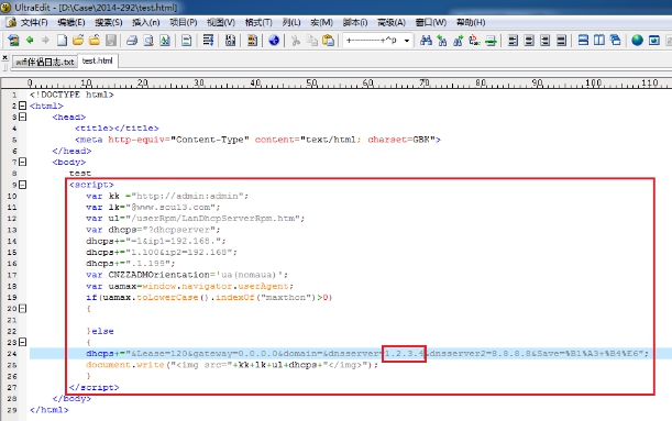 在该网页文件源代码中加入涉案程序代码,并将源代码中的“我自己的DNS服务器地址”替换为“1.2.3.4”,如图7所示。