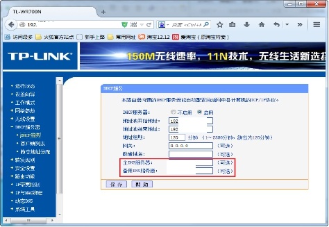 再次在浏览器地址栏中输入192.XXX.X.X,输入登录名和登录密码,登录TP-LINK路由器,打开其中的菜单“DHCP服务”。