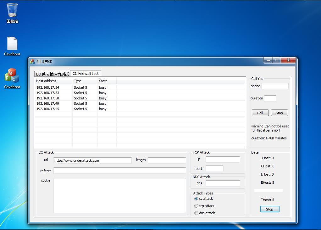 从“攻击发起服务器”上运行攻击程序“Csvchost.exe”,启动界面如下图所示: