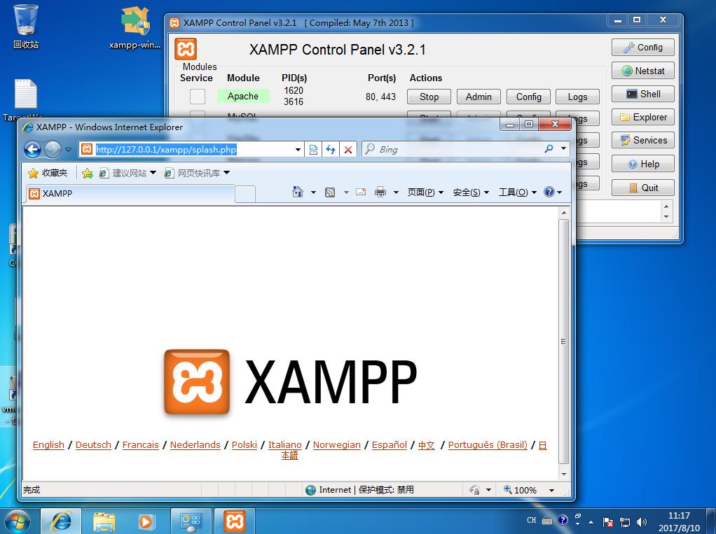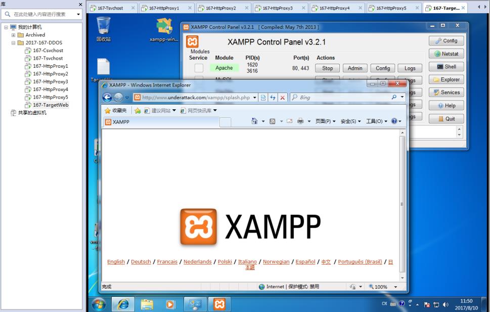 在虚拟机“167-TargetWeb”中安装配置XAMPP程序,安装完成后页面显示内容如下图所示:
